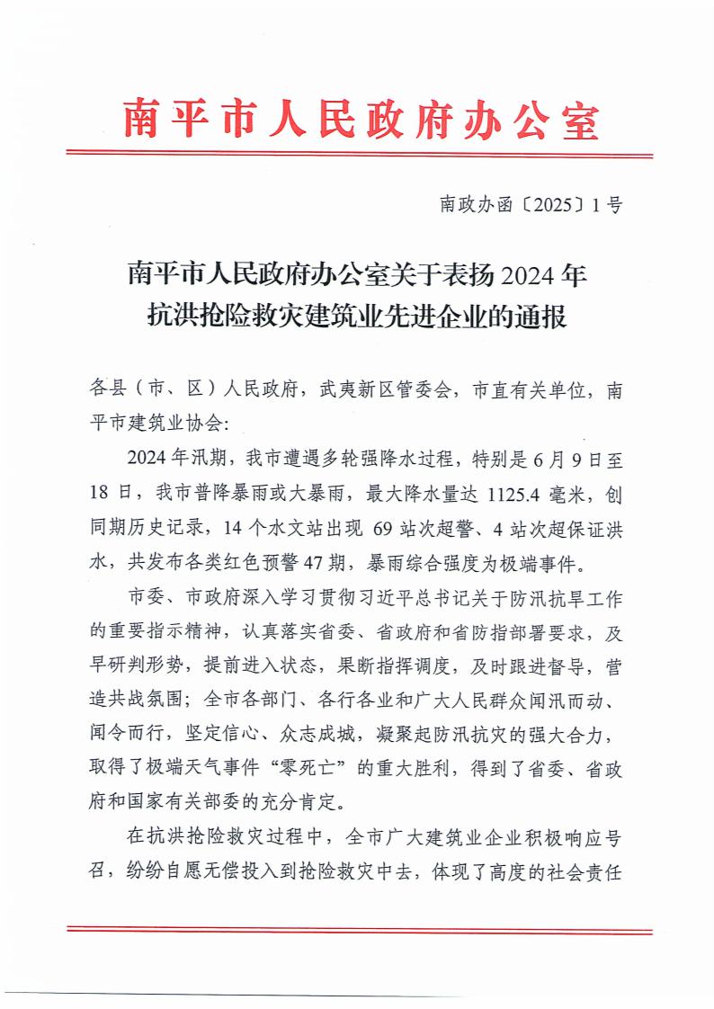 南政办函[2025]1号关于表扬2024年抗洪抢险救灾建筑业先进企业的通报